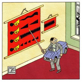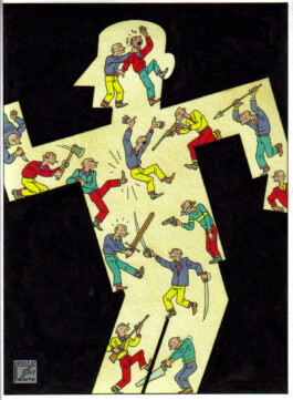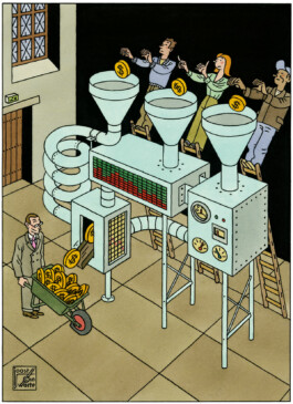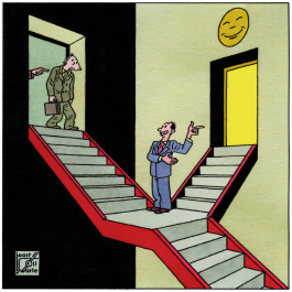 Illustrating an article in The New Yorker begins with reading it. Often, up to three times. I try to express the article’s essence in a single illustration. This is never done literally; it’s always my interpretation. I often make several sketches from different points of view and then discuss them with art editor Chris Curry. The New Yorker articles are extremely well-written and after working so intensively on them, they remain imprinted in my memory.