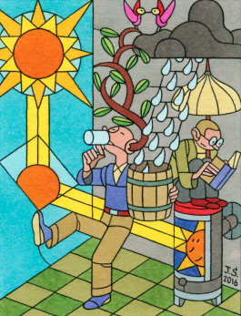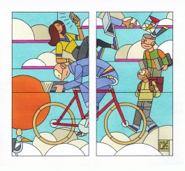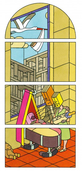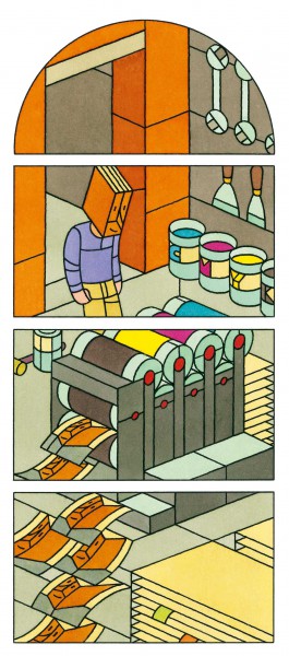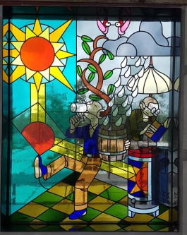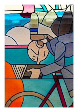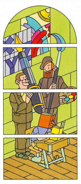 In 1999 I designed stained-glass windows for the first time: 34 for the staircases of a subsidized housing complex in Amsterdam. The largest window I designed was for the Palace of Justice in Arnhem. In it I depicted a society in which people treat each other badly in all kinds of ways. I also made stained-glass windows for several schools in The Hague and in Haarlem. Commissioned by publisher Jacques Glénat in Grenoble, I designed ten windows for the library in the Saint Cécile Chapel, which depict the birth of the book as seen from the publisher’s perspective.